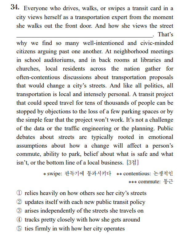 이 지문의 요지를 요약하자면 자신이 교통 전문가라고 말하고 있고 대중교통 프로젝트나 변화가 어떤 데이터나 교통 엔지니어링, 계획의 문제가 아니라 사람의 통근, 주차 능력, 안전한 것과 그렇지 않은 것에 대한 믿음, 지역 사업의 수익에 어떤 영향을 미칠지에 대해 감정적 가정에 뿌리를 두고 있다라고 하고 있네요 그러므로 대중교통에 프로젝트나 변화에 대해서는 자기 자신이 어떤 행동반경을 가지고 있는가와 또 더 나아가 나한테 얼마나 이익이 되는가가 중요하다 와 관련된 답안을 찾으면 되겠습니다. 그래서 4번이 되겠군요^^